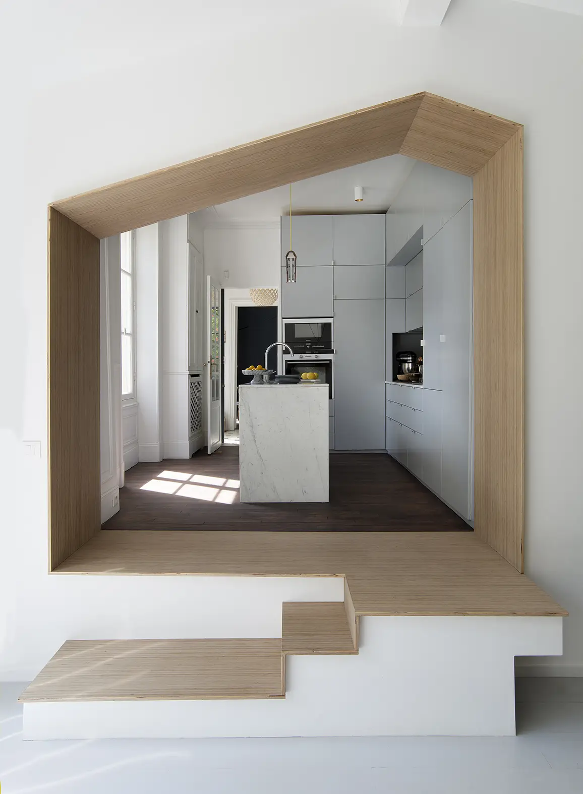 Agencement d'une maison de 1860. Le mur de la cuisine a été percé pour connecter la pièce à l'espace contigü, un ancien garage, transformé en salle à manger. Un grand encadrement en bois relié à quelques marches, assure la connexion entre les deux espaces.