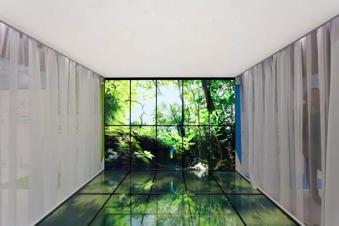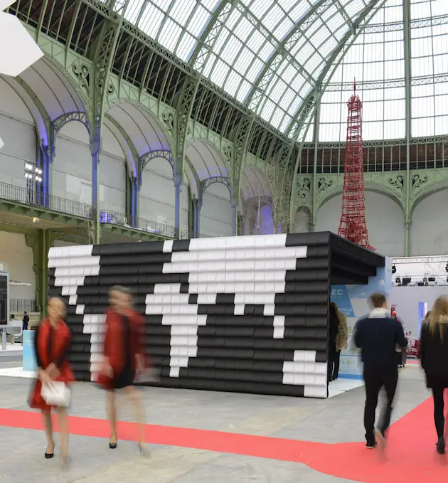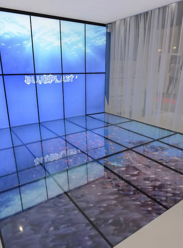 Le stand est composé d'une peau réalisée avec des feuilles de plastique biodégradables. Les nuances en noir et blanc forment une planisphère. A l'intérieur du stand, des écrans situés au sol et au mur, projettent des images d'écosystèmes dont le dessein est de sensibiliser à la pollution des océans par les plastiques.